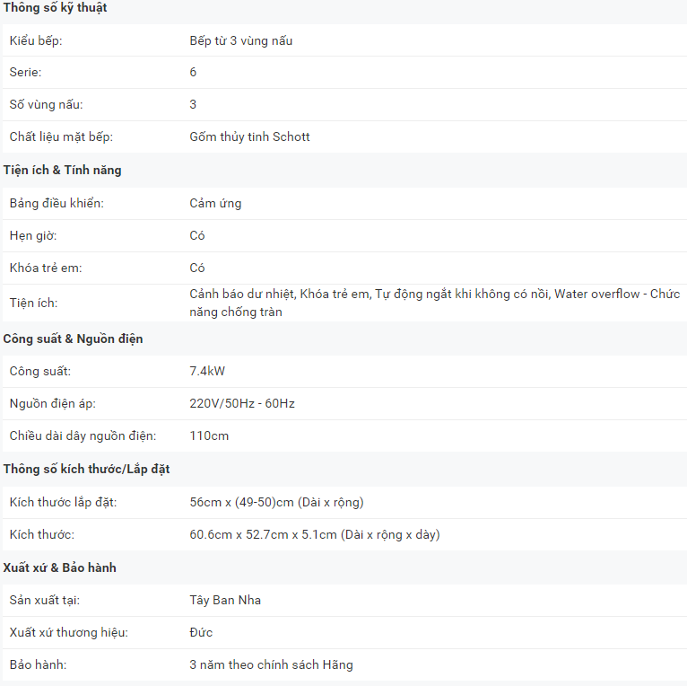 Tel: 0976 199 639Bếp từ Bosch PID675HC1E là dòng sản phẩm cao cấp với thiết kế sang trọng, lấy cảm hứng từ phong cách Châu Âu. Được sản xuất tại Tây Ban Nha, bếp sử dụng các vật liệu cao cấp, tạo nên hiệu năng nấu nướng mạnh mẽ và độ bền vượt trội. Với mặt kính gốm thủy tinh Schott Ceran, Bosch PID675HC1E không chỉ bền đẹp mà còn dễ dàng vệ sinh, góp phần duy trì vẻ sang trọng trong không gian bếp qua thời gian.