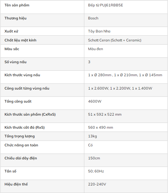 Tel: 0976 199 639Bếp từ Bosch PUJ61RBB5E là một trong những model thông dụng và được nhiều người ưa chuộng của thương hiệu bếp từ Bosch. Sản phẩm thiết kế 3 vùng nấu cảm ứng từ siêu tiện lợi cùng mặt kính Schott Ceran đến từ Đức bền bỉ và có khả năng chịu lực cao. Đồng thời, các tính năng hiện đại, thông minh cũng được sản phẩm sở hữu. Đây chắc chắn là một lựa chọn không thể tuyệt vời hơn dành cho gia đình bạn.