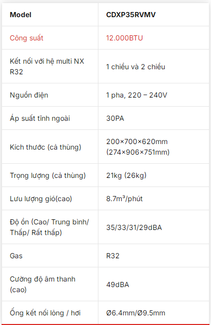 2.Thông số kĩ thuật và tính năng của dàn lạnh Multi Daikin CDXP35RVMV